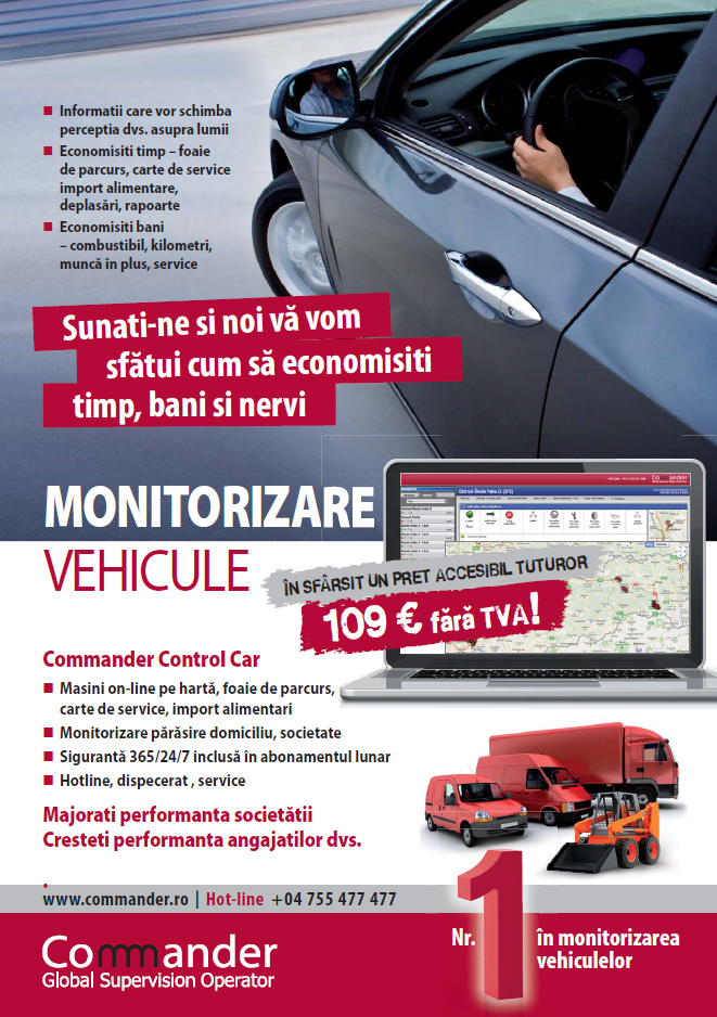 letak_monitoring_ROTe-ai gandit vreodata ca poti investi in sisteme de monitorizare flota auto astfel incat tu sa fii pus la punct cu tot ceea ce tine de autovehiculele tale? Vrei ca neplacerile cu care te confrunti acum sa fie doar niste amintiri neplacute? Ia acum legatura cu reprezentantii Commander Systems pentru a te pune la punct cu tot ce tine de sisteme eficiente de monitorizare a flotei auto! Fie ca flota ta auto este formata preponderent din autoturisme mici sau autoturisme mari, tu vei sti mereu unde se afla ele si daca au fost sau nu implicate in accidente. Commander Systems isi propune sa aiba grija de masinile tale pentru niste costuri infime!