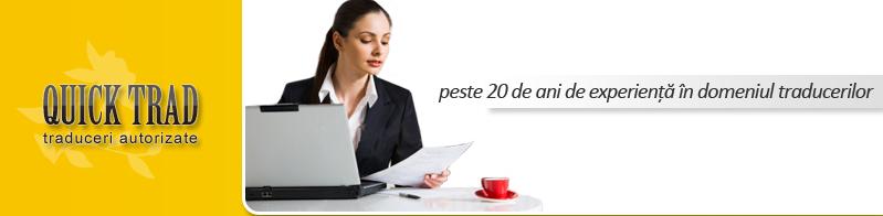 Quick Trad are o lunga experienta pe piata traducerilor din Romania, firma luand nastere in anul 1990. In prezent, datorita numeroaselor solicitari, Quick Trad dispune de 6 calculatoare performante pentru traduceri, un copiator profesional, 4 imprimante profesionale Hewlett Packard si un scanner. Prin intermediul acestei aparaturi dar si datorita personalului calificat, Quick Trad poate executa cu succes traduceri din limba straina in limba straina, traduceri tehnice, stiintifice, juridice, administrative si medicale, redactare de acte, completari de formulare, acte de emigrare, CV+Scrisoare de intentie, legalizari copii acte, interpretare, carti de vizita si traduceri si legalizari in regim de urgenta.